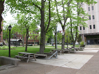 Bom, o campus lembra muito o da UFSC, é grande, bem arborizado, alguns espaços abertos para o pessoal utilizar no verao, organizado, limpiho e coisa e tal. O interessante que ele é diferente da UFSC, mas igual a outros campi (nao tah errado, plural de campus é campi mesmo) do Brasil, totalemtne aberto dentro da cidade, sem nenhum portaozinho. Mas o mais interessante, é que provavelemtne o campus foi crescendo aos poucos no meio da cidade, porque existem ainda algumas casas (que este blogueiro esperto nao tirou foto) no meio do campus. Sendo que a maioria a universidade comprou e usa para departamentos administrativos tipo secretaria de etica, secretaria pra fazer carteirinha estudandil, secretaria do departamento de musica gospel, e por ae vai. No entanto, algumas casas continuam sendo casas, entao, existem individuos que moram dentro do campus literalmente. Uma colega minha (a unica por sinal) de lab, mora entre o prédio de farmacia e letras.